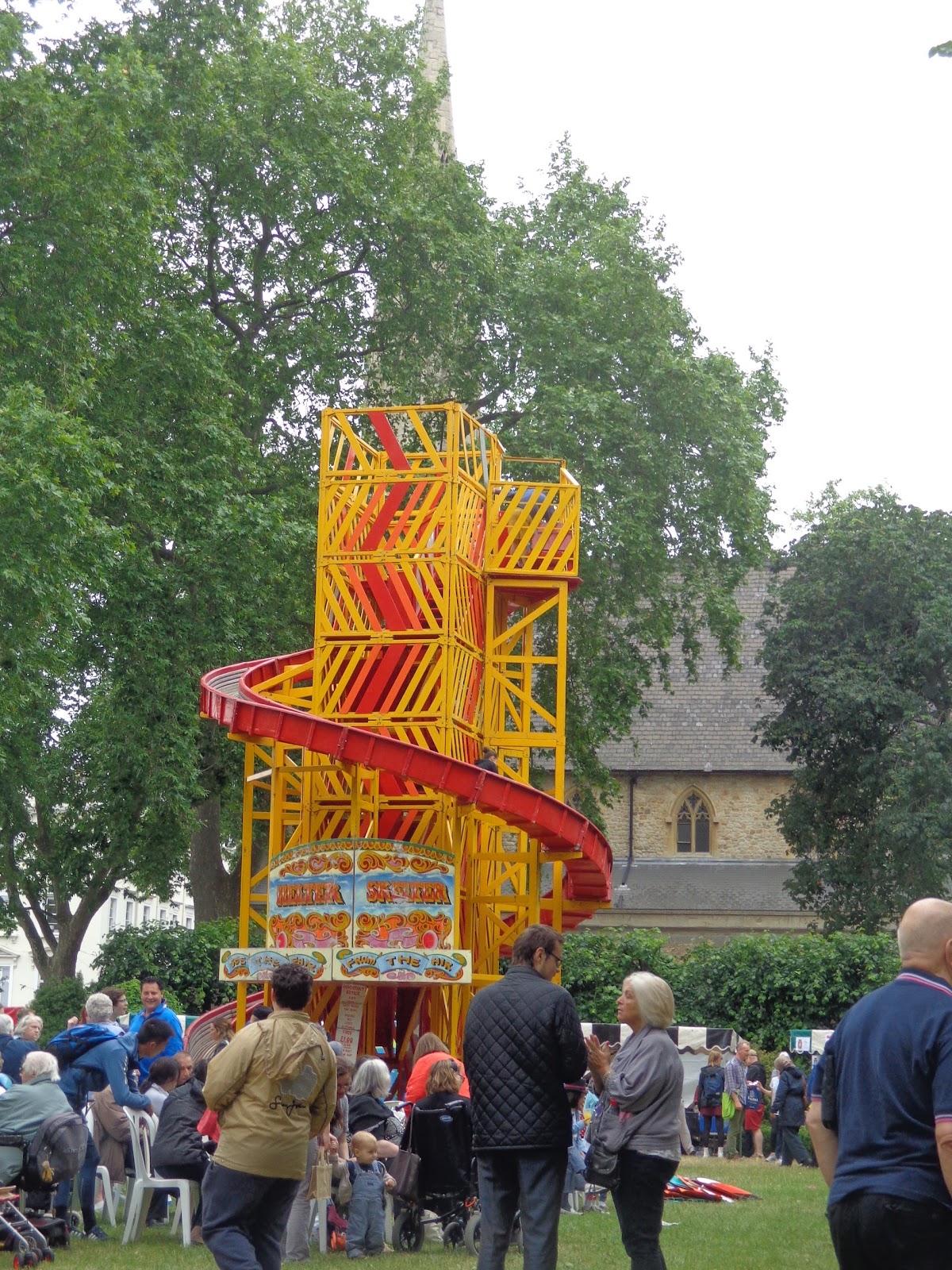Across the street to the north, in St. George's Square, there was a very welcoming atmosphere at SouthWestFest, where a person dressed in a rabbit or chipmunk or rat costume was greeting people (top). I was expecting a larger community festival, but the Gala Day was more like the lawn fetes of my younger days, except with trampoline-bungee jumping (bottom left) and a slide as tall as a cathedral (bottom right).