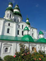 On the other hand, Pyatnytska Church had quite a manly feel, possibly due to the nearby wooden sculpture of Prince Igor the Brave (top). Unfortunately, the church was closed for repairs, but I did attempt to tap into its treasures by participating in the ritual touching of a stone from the original structure (bottom left). In the same park sits a statue of Bogdan Khmelnitsky, a Cossack leader who called on Russia to help free Ukraine from Polish rule. Of course, Russia seized the opportunity to become rulers themselves, much to Khmelnitsky's regret, so in a symbolic move, after the fall of the Soviet Union, the statue was turned so its back faced Moscow.On our way to Chernigiv the second time, we stopped in the village of Kozelets, home to the Cathedral of the Nativity of the Blessed Virgin (top). People go out of their way to visit the church because of its impressively high and uniquely colored iconostasis (bottom left). We were lucky enough to also be granted access to the basement burial place of Natalia Razumovsky, respected for refusing to sacrifice love for reputation and, ultimately, gaining renown by founding the church (bottom right).